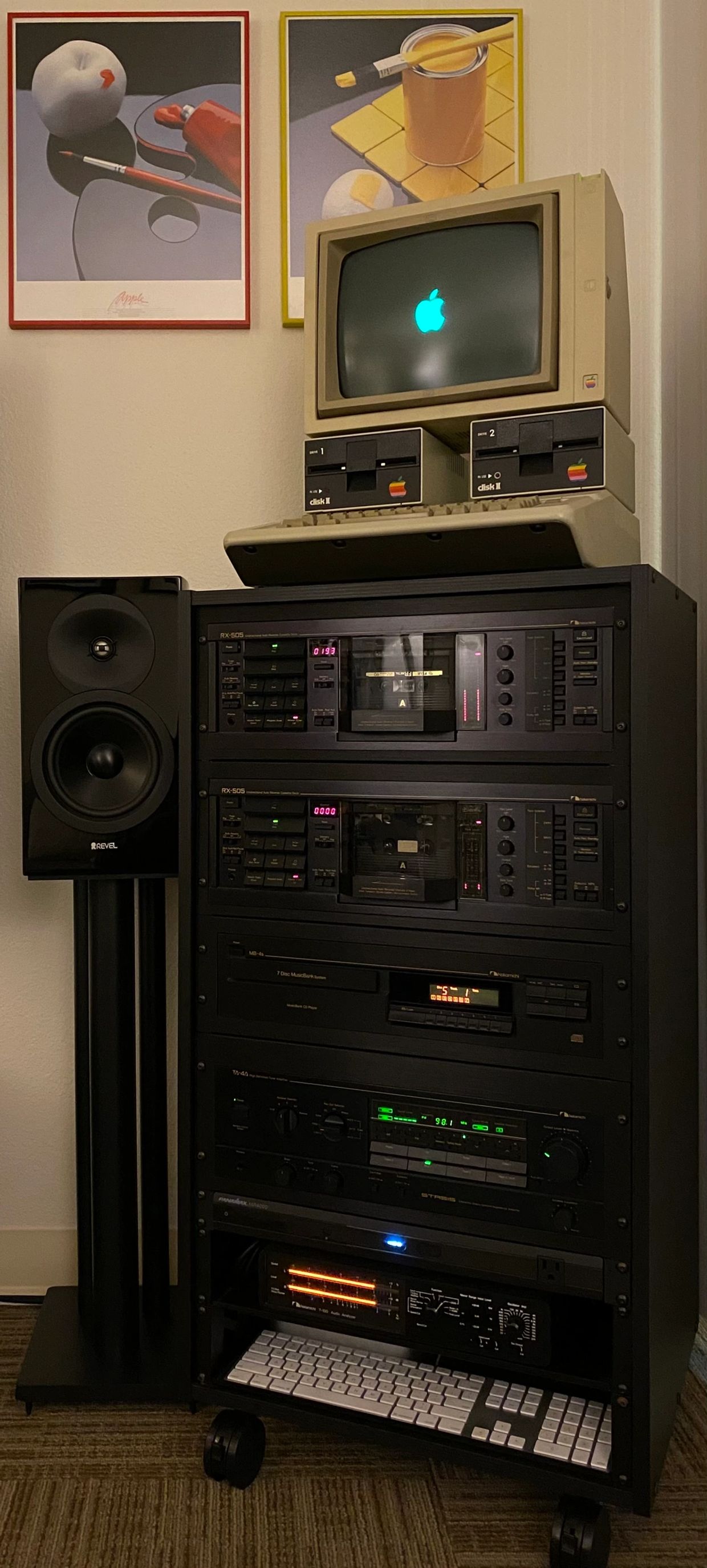 We've come a long way! The stack is now composed of – top down – a pair of Nakamichi RX-505s and a Nakamichi MB-4s feeding into a STASIS-based (of Nelson Pass) TA-4A, with a T-100 keeping it all in line. The rack is topped off with a fully-operational Apple IIe, and its dulcet tones are sung by a pair of Revel M16s. More than two hundred prerecorded tapes, from a-ha to Young M.C. and about eight days worth of blank tapes not pictured.